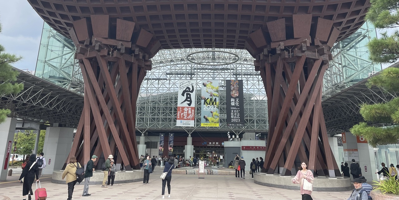 金沢駅のメインエントランスである東口にある巨大なドームです。シンボルである鼓門と駅の間にあり、バスターミナルやイベントスペースとなっていました。地下1階にも広場がありますが、いずれも賑わっていました。