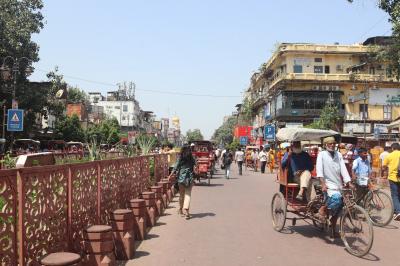 オールドデリーの中心部を東西に通る通りです。東側のスタートはレッドフォートのラーホーリ門の向かいです。車道のほか、歩道もとられてありました。ちょっと路地に入ると、迷路のようで、電気店エリアになっていました。
