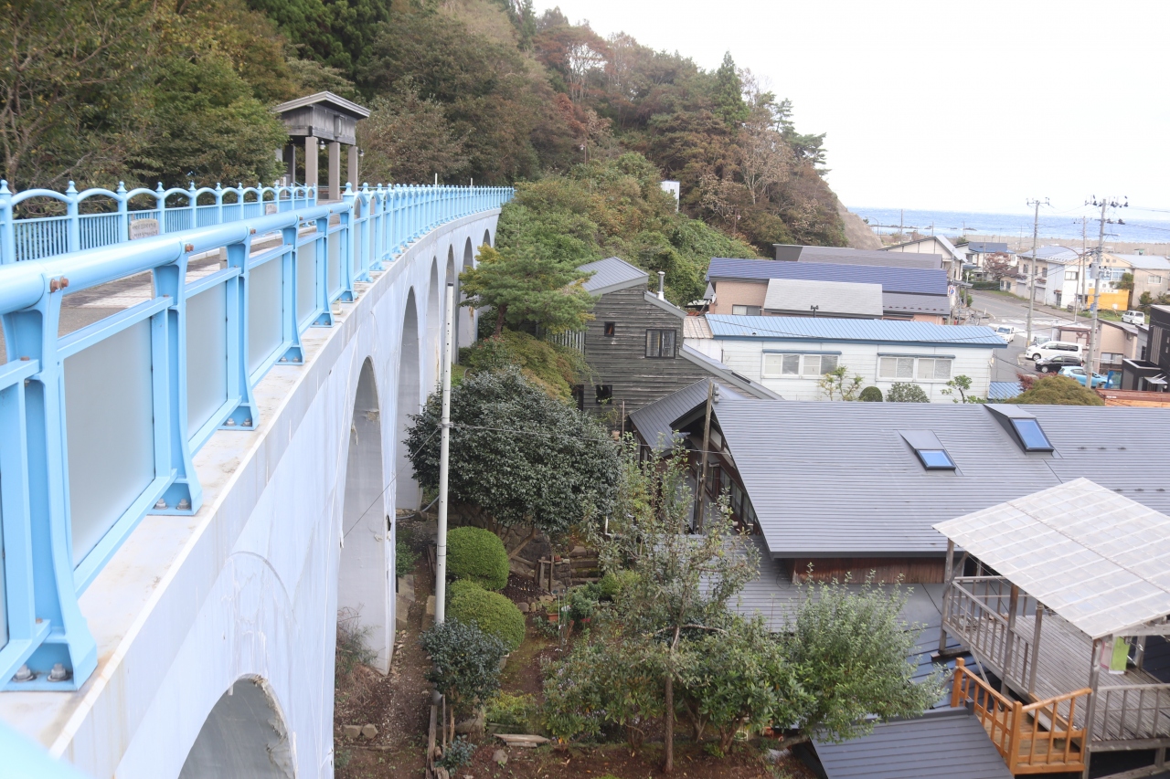 かつて大間へ計画された鉄道で建設が進みながら、途中で取りやめになった未成線の跡です。下風呂温泉街を見下ろすアーチ橋後は遊歩道として整備され、途中には駅ホームを模した足湯があります。街並みや海を眺めることができます。