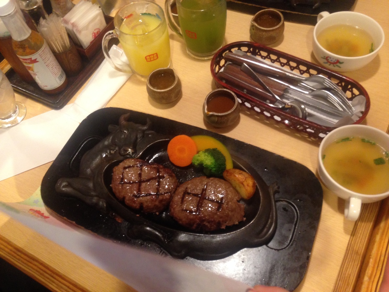 静岡の超有名ハンバーグレストランの静岡インター店。東京からの知人を案内しました。ファミレス風の店内は入りやすく、時間も中途半端でしたのですぐ席へ。俵型のハンバーグを鉄板に押しつけ、特製ソースをかけていただきます。油除けの髪エプロンでブロック。