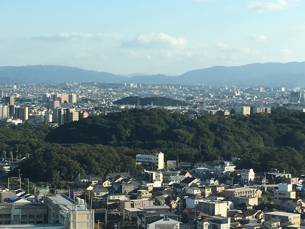 地上80m、市役所最上階にある展望台です。ぐるっと360度の展望が楽しめる回廊式ロビーです。19年に世界遺産登録された仁徳天皇陵を眺めることができます。前方後円の形まではわかりませんが、町並みの中に緑の低い丘のようです。