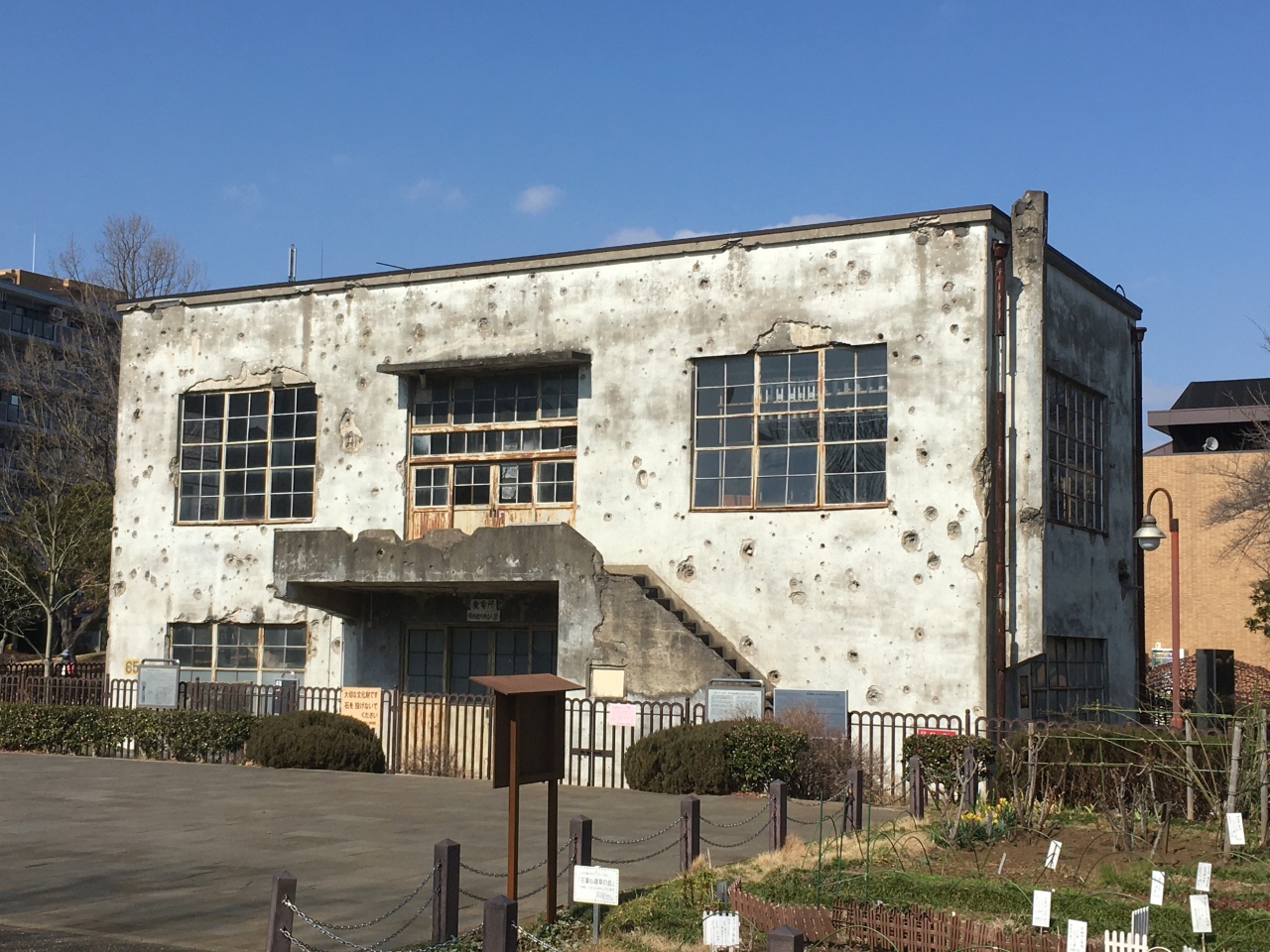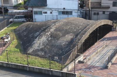 元陸軍調布飛行場の軍用機の格納庫です。国道20号沿いの住宅街の中にうすっぺらいかまぼこ型の格納庫が残っています。国道20号の歩道から俯瞰することができます。当時はたくさん残っていたそうですが、今は4基のみ、貴重な戦争遺産です。