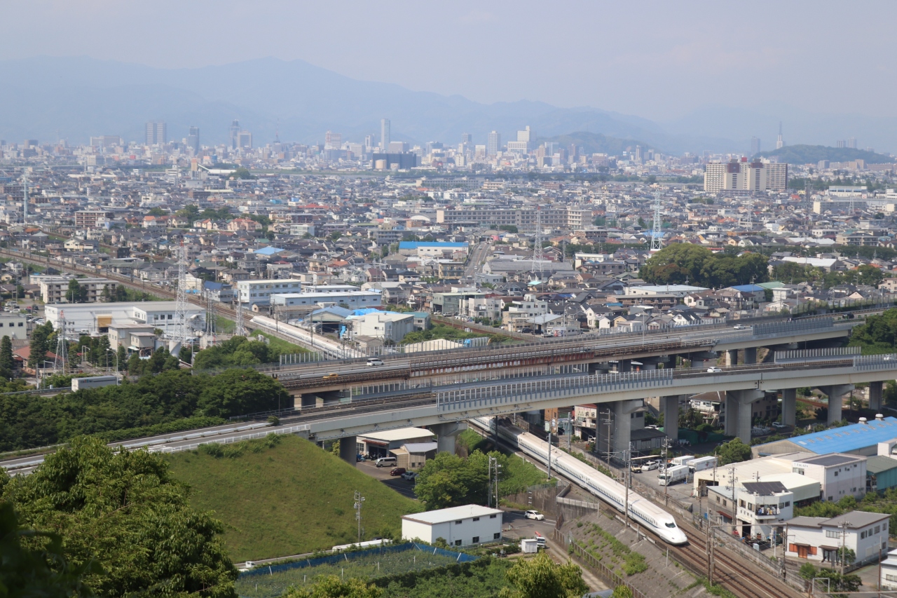 用宗駅か徒歩15分ほどの山城跡、今川氏の支城だったそうですが、今はなにも残っておらず、見晴らしのよい自然の展望台です。静岡市街を一望でき、市内を抜ける新幹線も模型のように走行シーンを見ることができました。この日は見えませんでしたが、晴れて空気が澄んでいれば富士山も見えるようです。