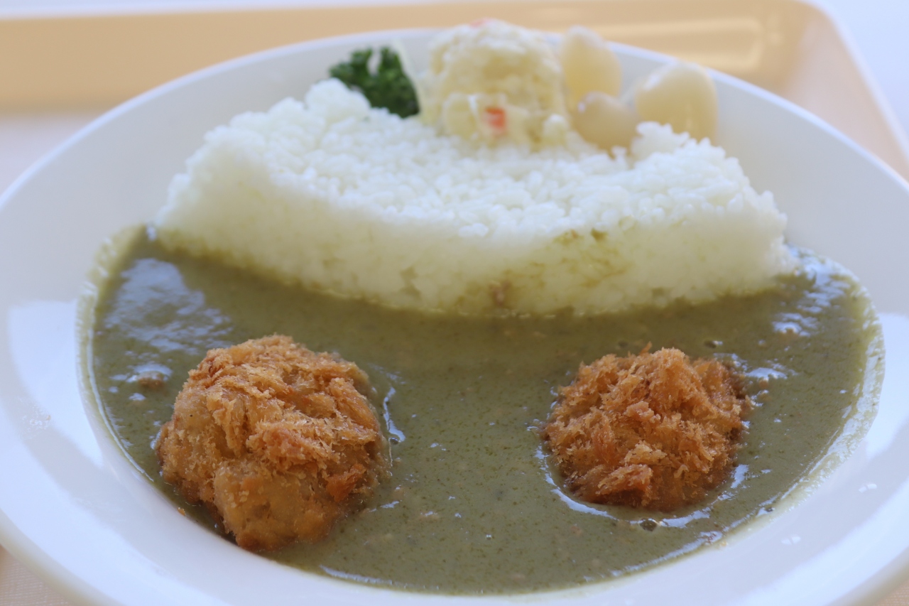 バスの黒部ダム駅から通路を抜けて、黒部ダムサイトの2階にあるレストハウスです。セルフサービスで軽食が取れますが、名物のダムカレーをいただきました。堰堤はごはんで、ダム湖はグリーンカレーで表現してます。ダム湖に浮かぶひとくちカツは遊覧船でしょうか。