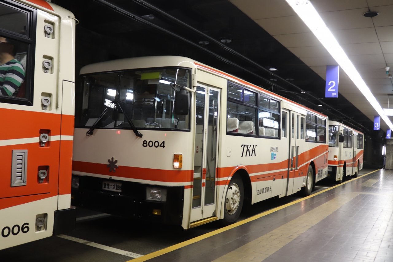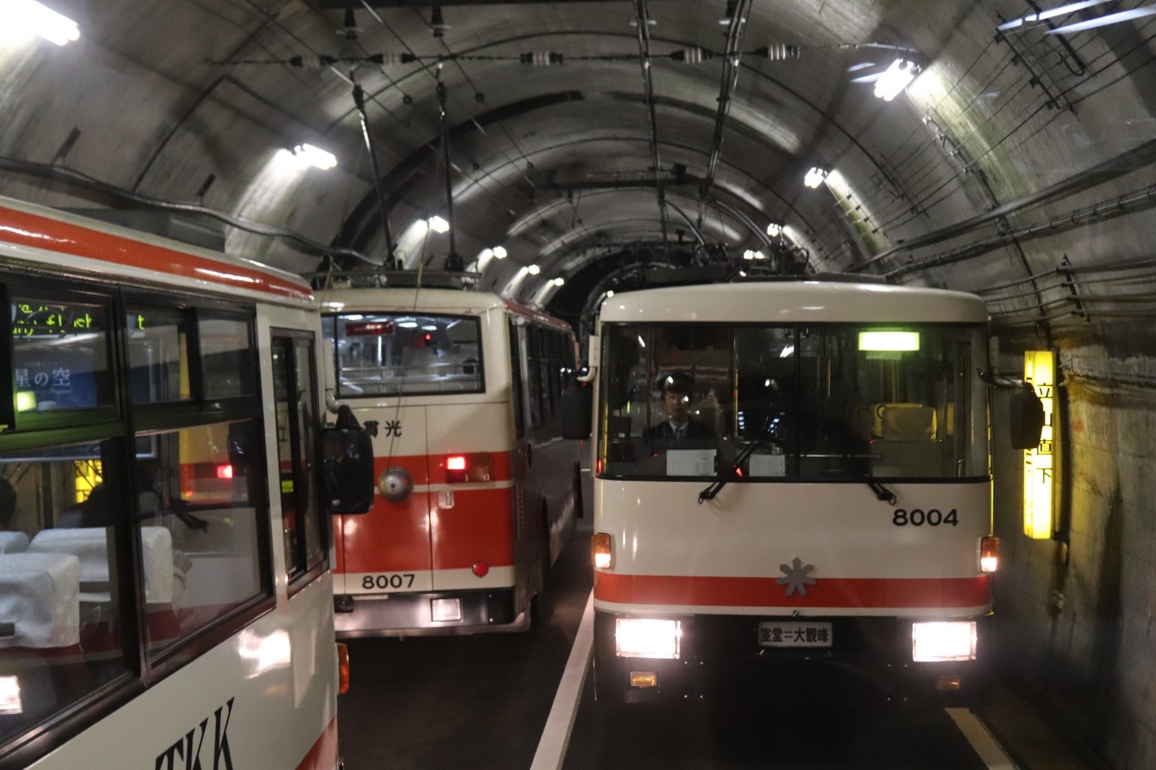 立山黒部アルペンルートの立山連峰直下の室堂と大観峰を結ぶバス。全線トンネルで、車窓は望めませんが、トンネルの上の架線から電気を取って走る珍しいトロリーバスです。扇沢~黒部ダムの関電バスが電気バスに置換られたので、日本では唯一のトロリーバスになりました。