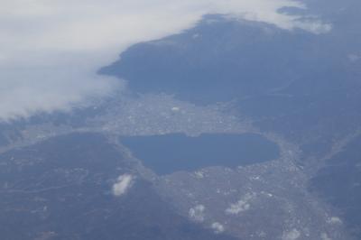 中央線、夕暮れの車窓からちらっと諏訪湖を眺めることができました。上諏訪~下諏訪は諏訪湖沿いを走りますが、建物にさえぎられます。ちょっと前、飛行機の窓からも諏訪湖を眺めることができましたが、こちらは小さい。