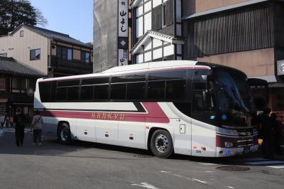 城崎温泉駅前でみかけた貸切タイプの観光バス。全但バスの共同運行でたった1往復だけですが大阪から城崎温泉への直通高速バスが運行されています。JR特急「こうのとり」より時間はかかりますが、お安い運賃で利用できます。