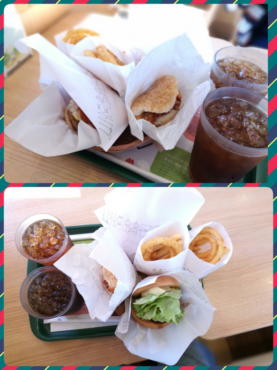 妻はてりやきバーガー、私はモスバーガーとライスバーガー海鮮かき揚げ塩だれでオニポテセット(*^^*)