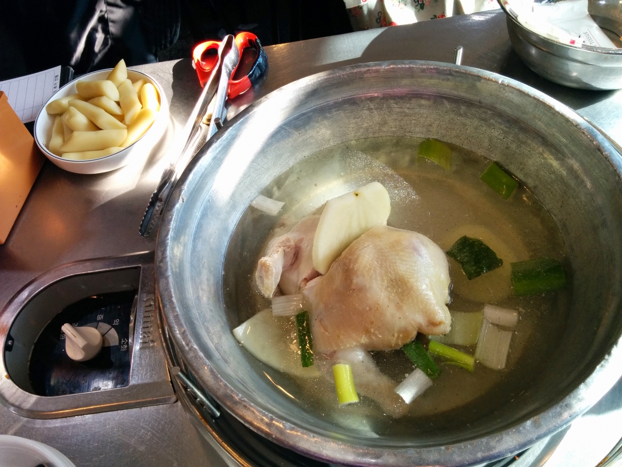席に着くと何も言わずとも鶏の入った鍋がセッティングされ