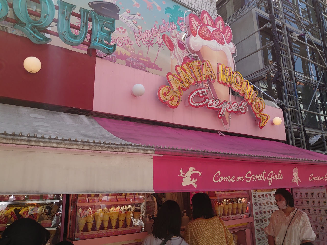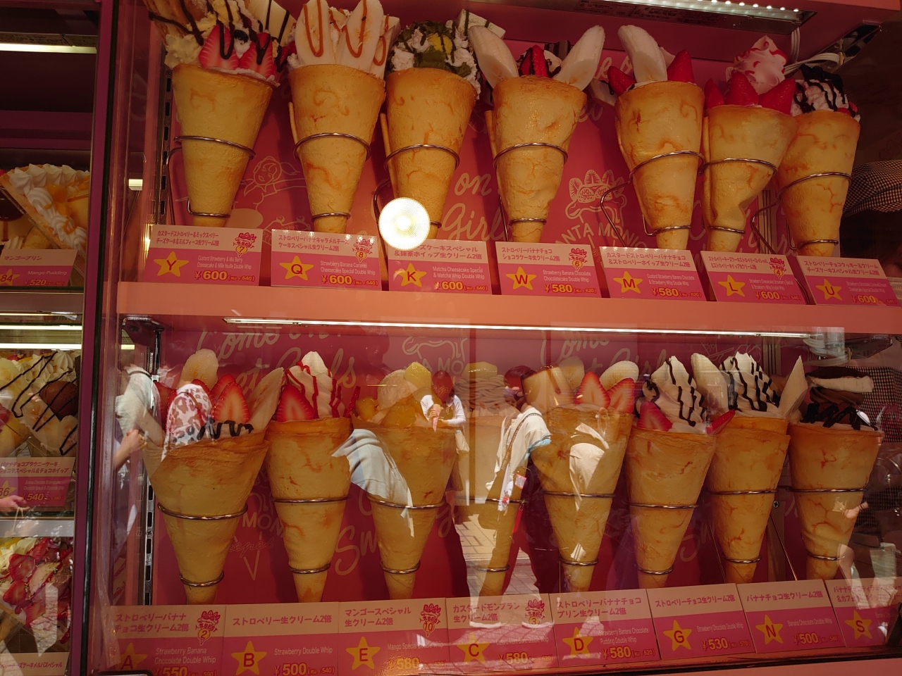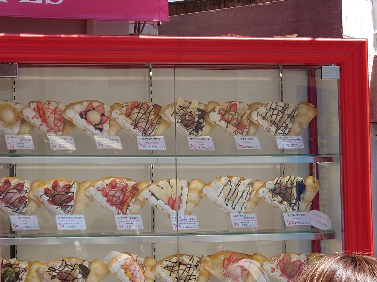 原宿通りだけでも複数のクレープショップがあります。特にここのクレープショップの強みは2倍サイズがあることです。サンプルを見たけど、とにかく2倍サイズはデカイです。ショーウィンドーの中にたくさんのクレープのサンプル品があり、注文する際は番号ないし記号で注文します。