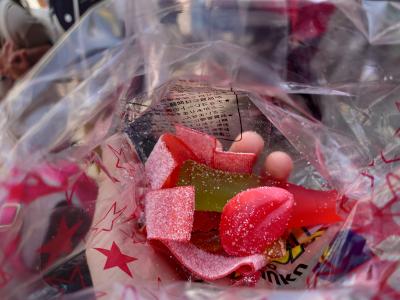 店舗内ではコロナ対策としてビニール手袋をつけることがルールでした。多種多様の一般のコンビニでは食べたり見ることのできないカラフルなグミが売られています。味ももちろん文句なし!一つ一つの果実の風味や味が濃くて病みつきになります。グミは量り売りとなってます。