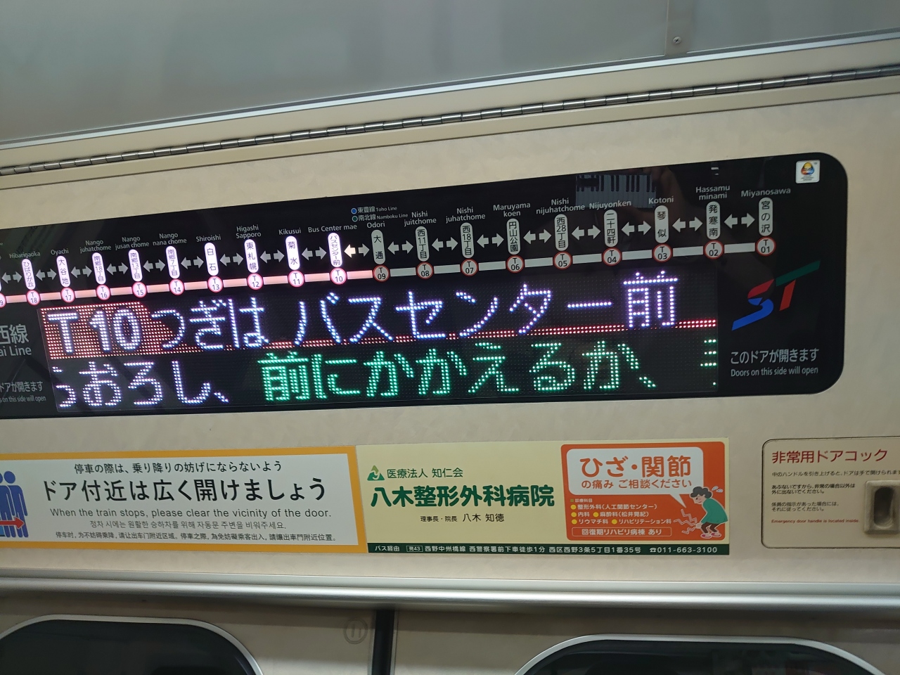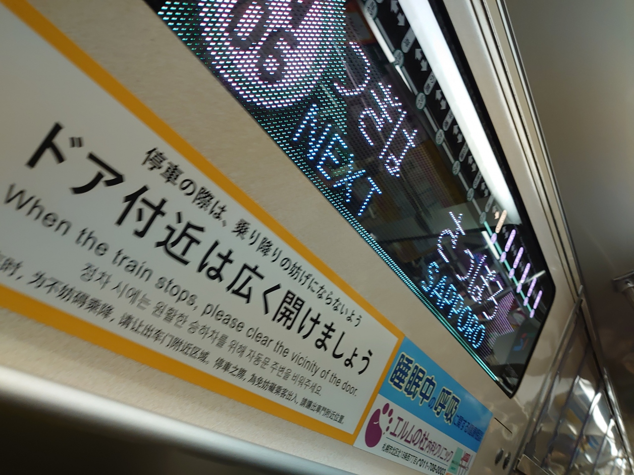利用日が土曜日ということもあって、南北線は言うまでもなく超混雑してました。特に札幌~すすきの間は必ず混雑すると思います。南北線も例外なく社内の電光掲示板はLEDでカラフルになって、くっきりと見やすくなっています。