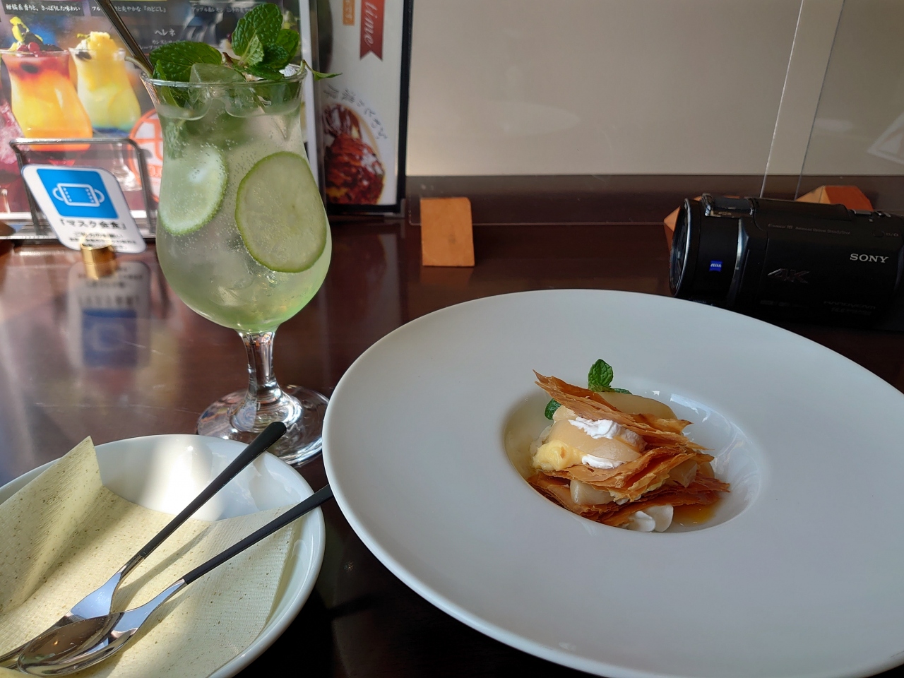 ノンアルコール飲料は4種類あり、今回注文したのはリンゴ風味のミント付き。そして桃のミルフィーユです。桃のミルフィーユについては「本日のメニュー」という名前でした。どうやら日にちによって提供されるものが違うようです。- 旅行時期