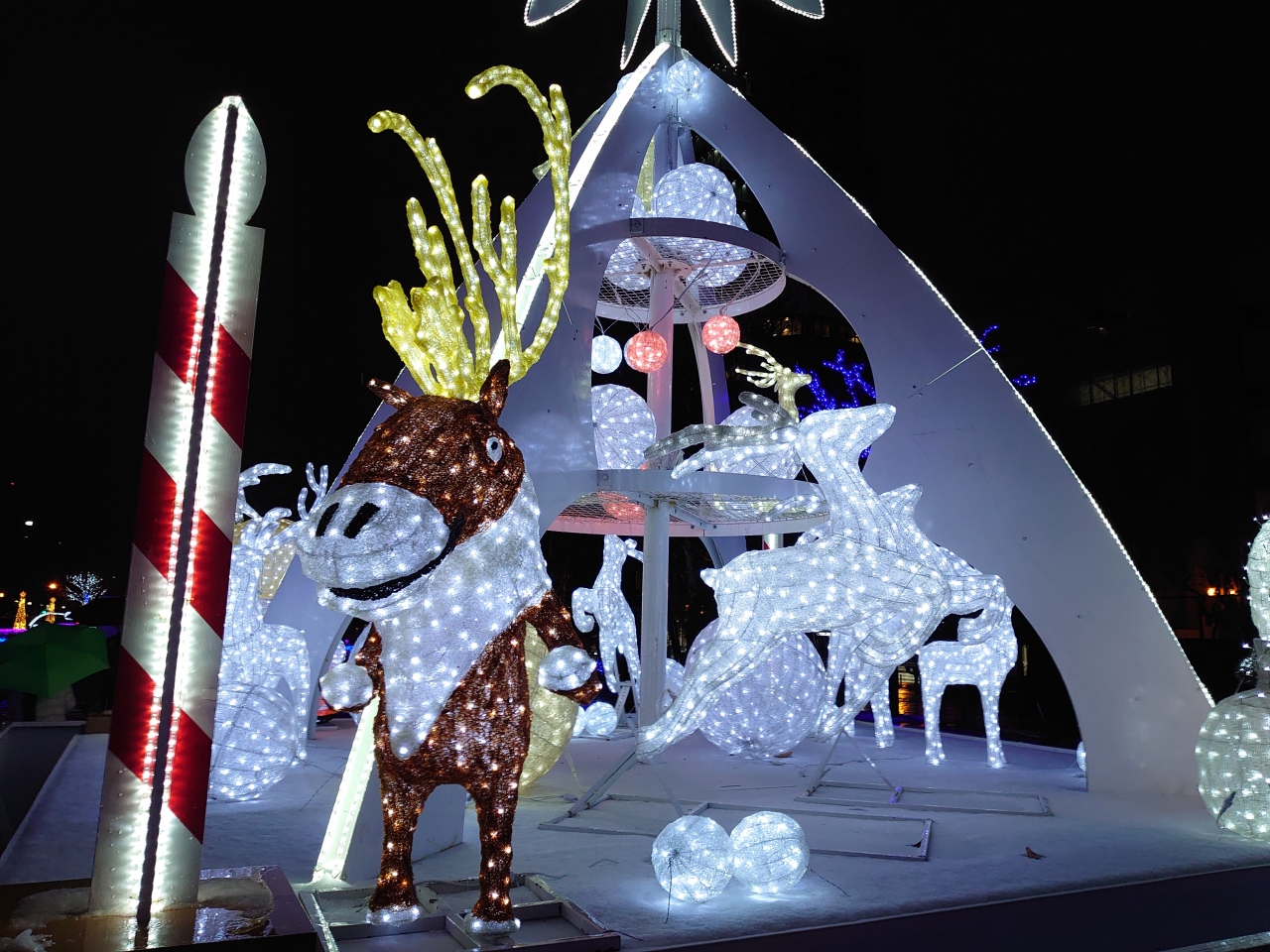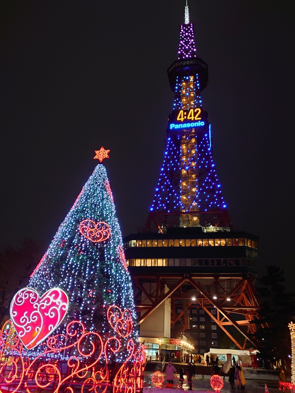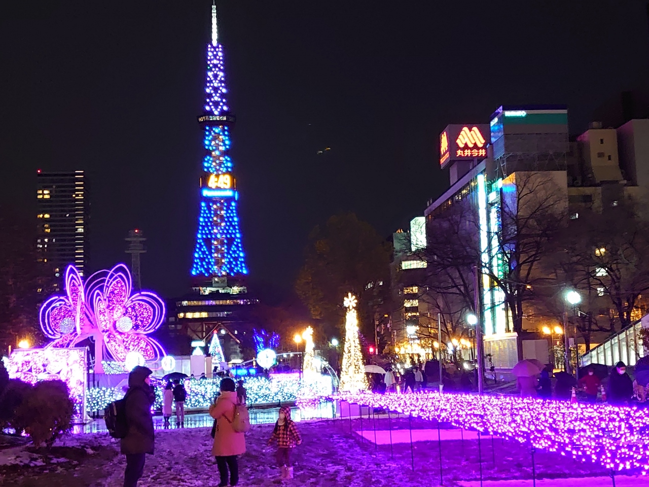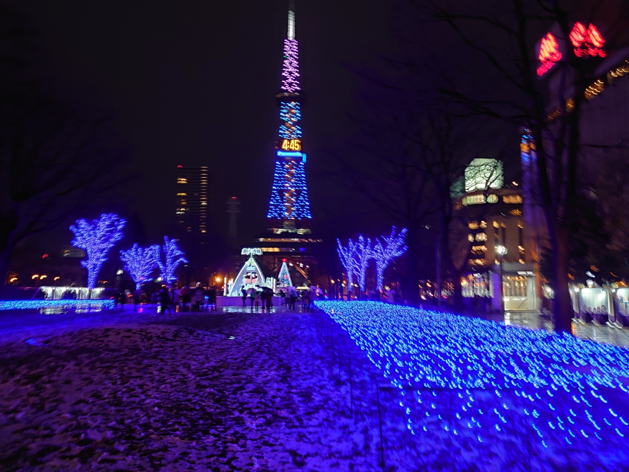 装飾は2年前と変わりませんが、寒くても人々が集い楽しめるような装飾や造りになっています。青色で敷き詰められた絨毯が広がっているような青々しさがきれいなイルミネーションが素敵です。コロナ禍の中でしたが、多くの人が訪れて楽しい気分になれました。テレビ塔から大通り公園全体がイルミネーションで輝いており、大人も子供も楽しめる、どの角度から撮っても映えると思います。