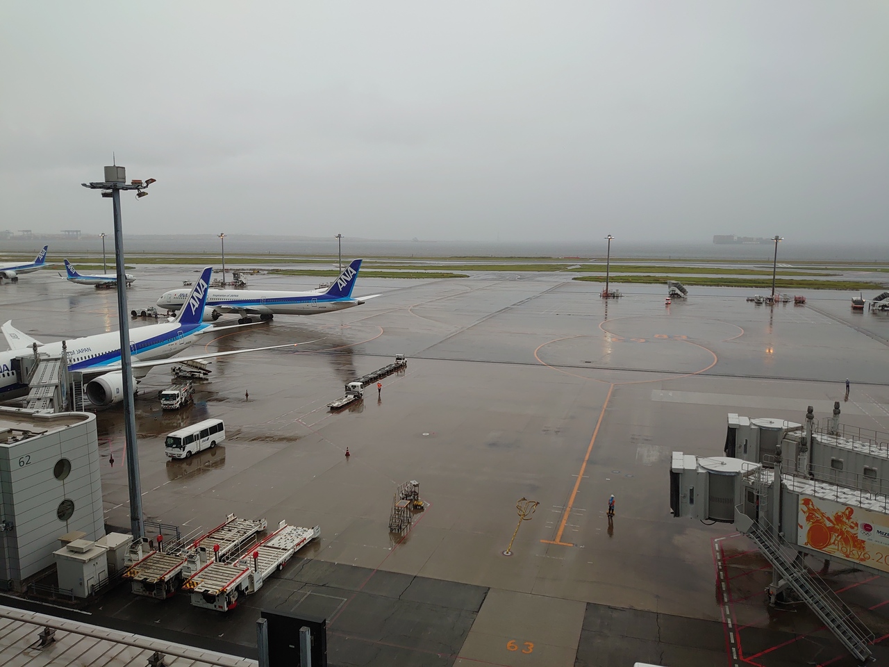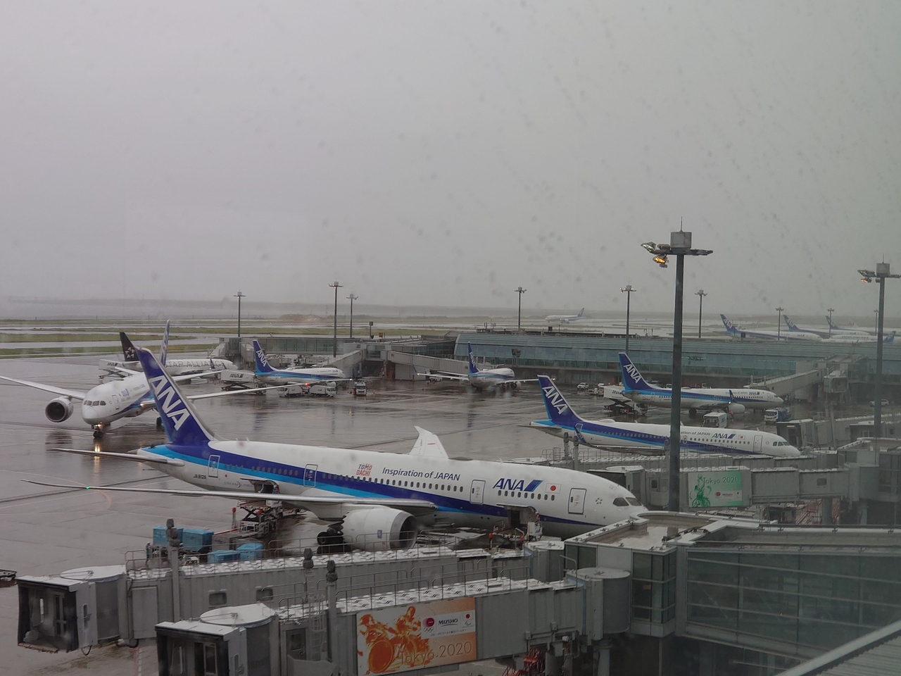 第2ターミナルの展望デッキはC滑走路に面しています。超長距離路線の国際路線の機材も最長のC滑走路を利用するので、ANAだけでなく外国の機材も見ることができます。ところがオレが訪れた日はなんと土砂降り!!泣く泣く室内から飛行機を眺めることに。テンションが下げ下げの飛行機見学になってしまった…
