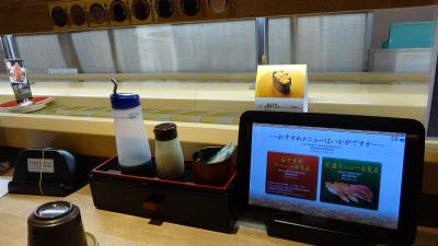 お盆ということもあり大分待ってる人がいましたが、オレが1人で来たということもあり順番が前後して3分くらいでカウンター席に座ることが出来ました。ここのお寿司屋さんは半分オートメーション形式のお寿司屋さんで、タッチパネルで自分の食べたい寿司を注文します。届けられる時も上部のベルトコンベアに乗せられて指定の場所まで運ばれます。
