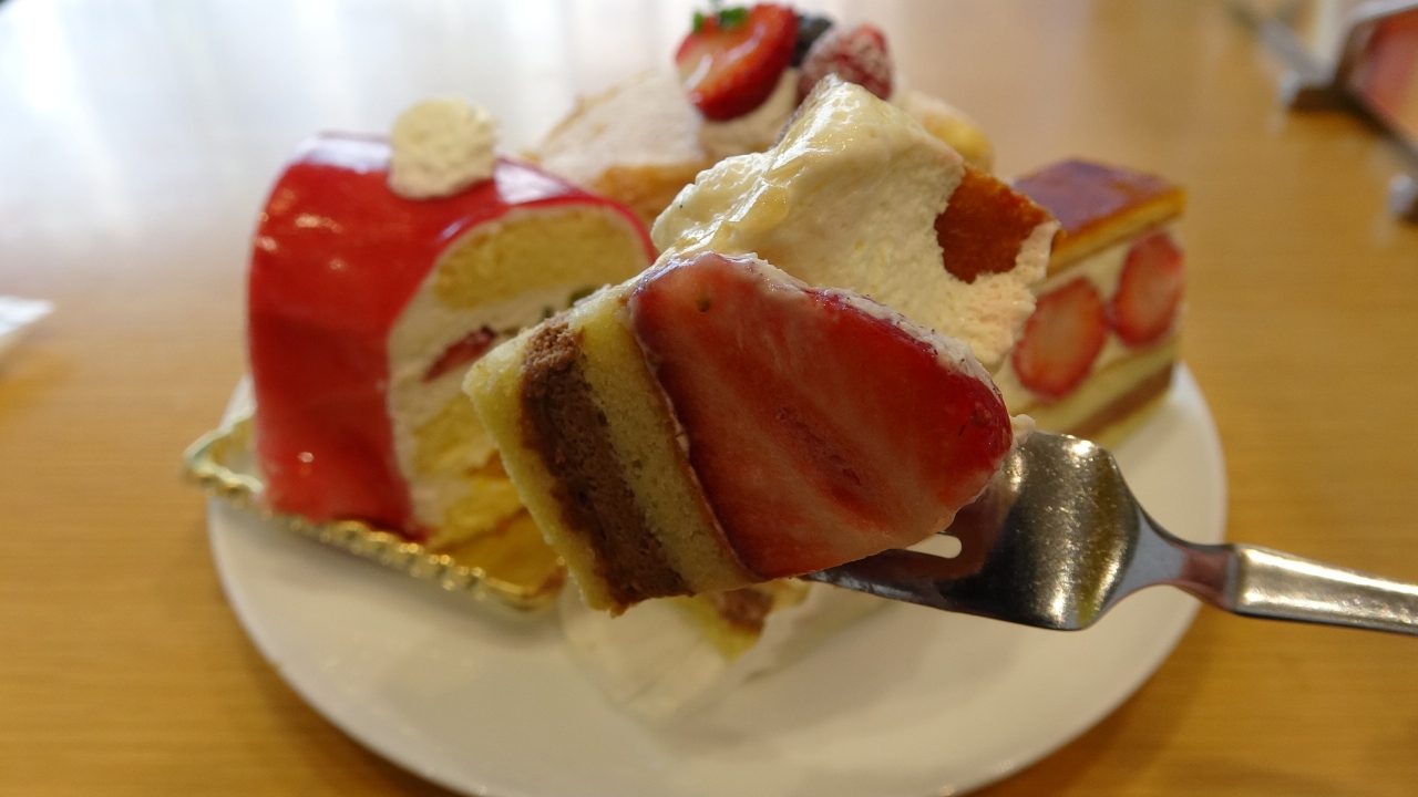 個人的な代表メニューはオムレットパフェですが今回はそれを頼まずに、別の3種類のケーキを食べて行きました!特に目を引いたのが外見がピンク色で中身がフルーツのサンドされた新作のケーキです。ケーキ自体とフルーツそのものの旨味が甘すぎず、適度に甘いケーキで非常に良かったです。- 旅行時期