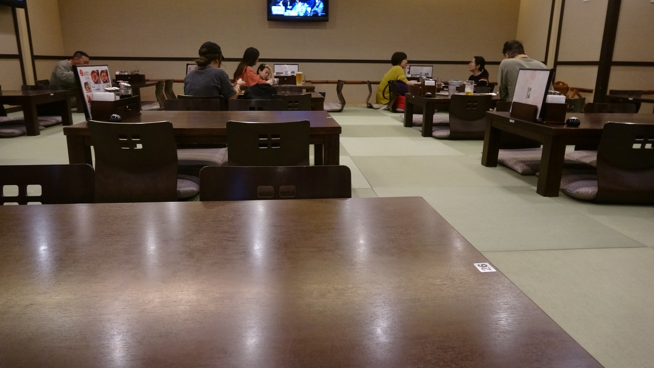 会計フロントの横には食事処があるのですが、夜中の3時くらいまで(だったと思う)営業してます。夜の9時半になると夜食メニューの時間になるので、そのメニュー表から注文をする仕組みになってます。場所は畳のお座敷形式ですので、楽しく過ごせること間違いなしです。実際俺が食事をした時も周囲の人は会話をしたりテレビを見たりして楽しそうに過ごしてました。ここにも水サーバーと緑茶サーバーがあります。
