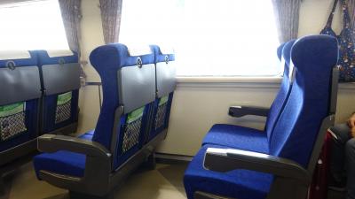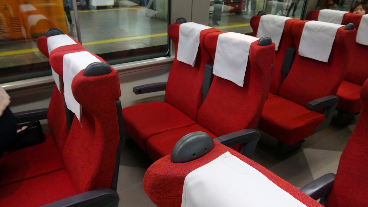 座席は赤でちょびっと際立つ車両でした。それ以外(常備されたパンフレット、座席の広さや座り心地など)は他の特急と同じです。- 旅行時期