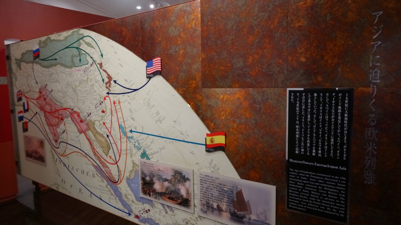 120分コースを選択し、見たものが歴史の流れを年代で示した欧米列強の植民地図でした。また、戦時中のビデオも上映されており如何に当時の日本人が過酷な年代を生き抜いてきたかがうかがえます。日本は植民地にされるか否かの国家存亡をかけた戦いでもありました。当時アジアで独立を保っていたのはタイ王国と日本だけです。アフリカにおいてはエチオピアだけです。