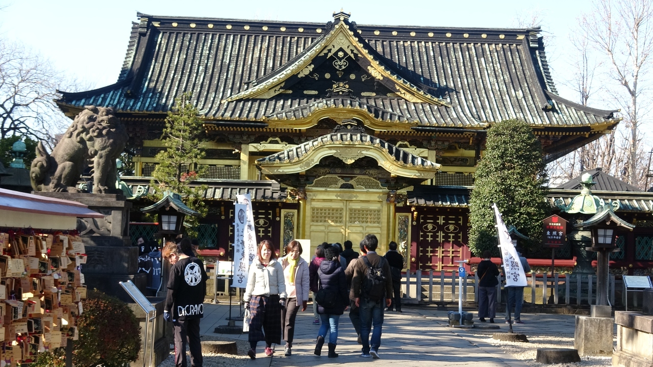最初に石でできた鳥居が入り口にあります。中に行くまでにいくつもの石灯籠が並んでいます。しかもたくさんです。行くその途中でボタン苑があって料金を払えば入れるのですが、あまりキレイに咲いてなくて入る気にならなかった...通りがかりでちょっとだけ見えます。本殿ににたどり着くと、扉から壁一部が金で装飾されていて扉の前には賽銭箱が置かれてます。思わず自分もお金がたくさん貰えますようにと祈りました。