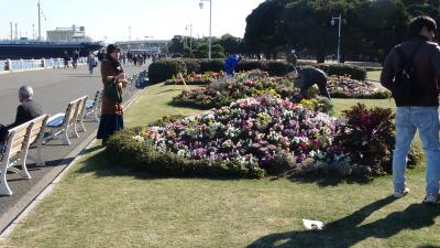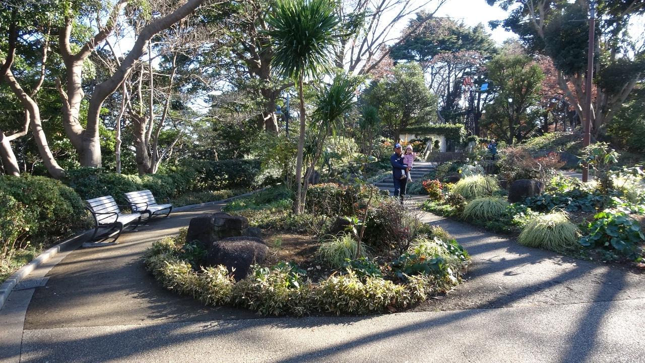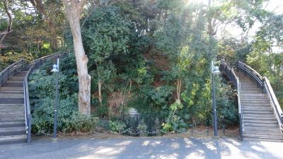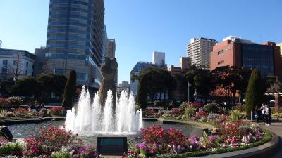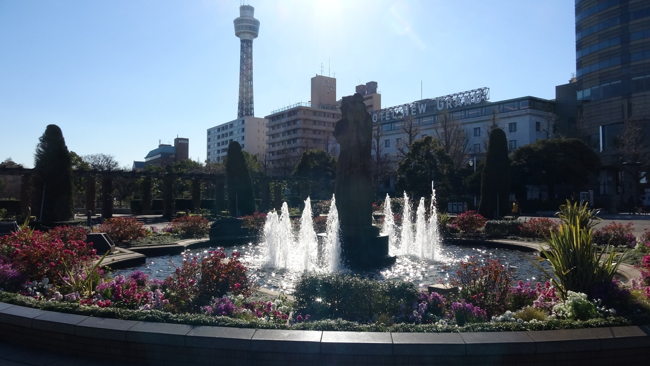 花壇に囲まれ更に噴き出る水の中に佇んでいます。写真では一見すると花がちゃんと咲いているかのように見えます。残念ながら1月ということもあり花壇の花は本来の色はしていたものの、しおれたりしぼんだり枯れたりとあまりキレイに咲いておらず聖なる泉が見劣りしてしまった。最初は聖母マリア様の像かと思ってました。山下公園の中にありこの公園自体が聖なる水で清められている雰囲気です。