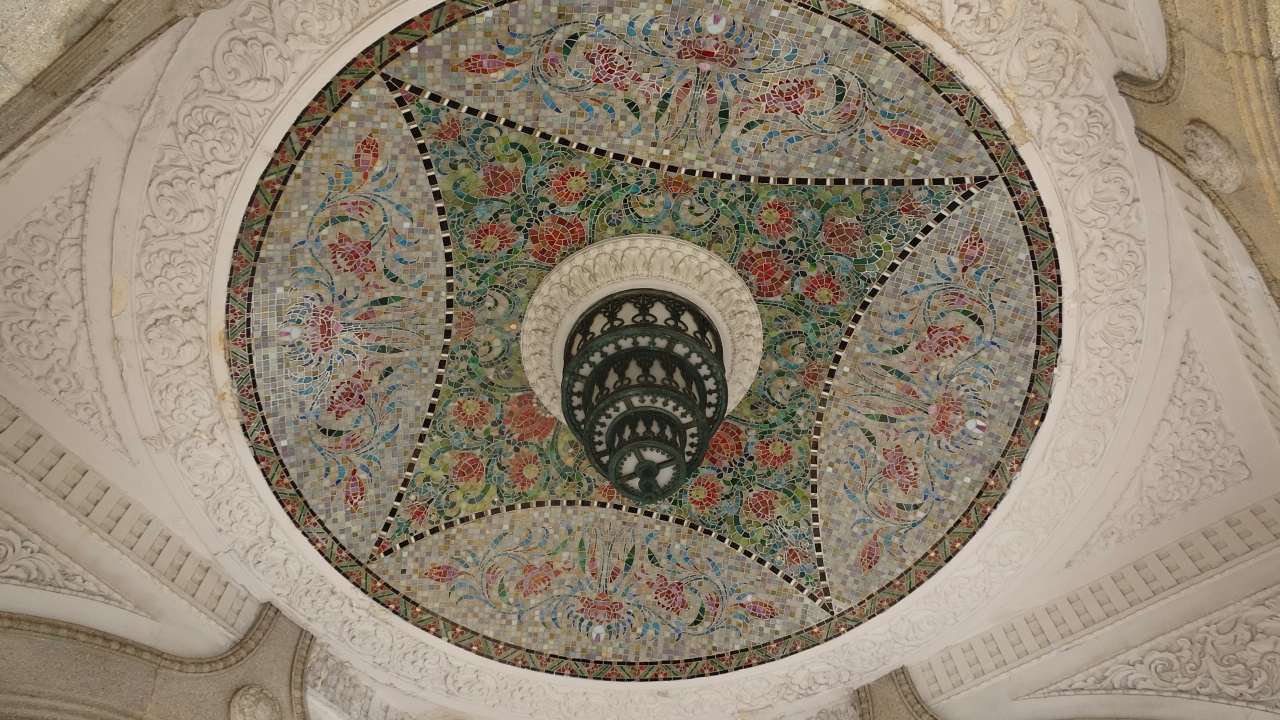 天井を見るとタイル張りされており幾何学模様のような柄を見ることができます。側にはこの水塔の説明書きがあります。- 旅行時期