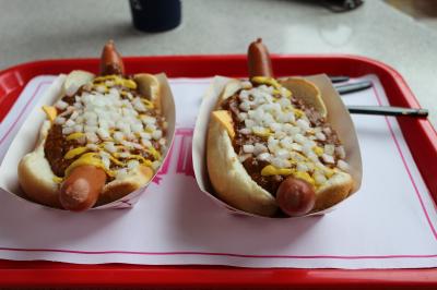 見た目よりしつこくなくて、辛いかと思ったら辛くなく、想像よりインパクト弱めでしたが、美味しく食べました。ポテトも二人で一つならイケルと思います。チリドックは流れ作業なのか、すぐに出てきます。外にテーブルが15くらいあります。- 旅行時期
