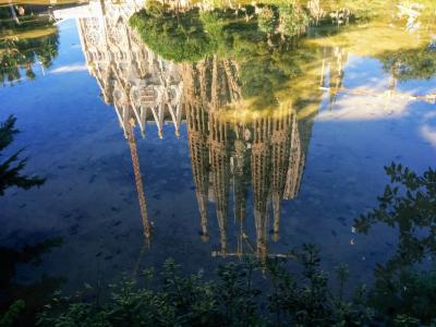 偶然近くにあった池にサクラダファミリア がうつり素晴らしい景色が見れました。