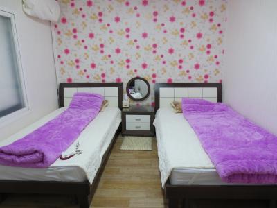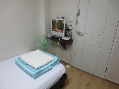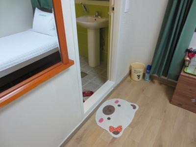 1年ほど前に宿泊しとても心地よかったので再び宿泊しました。一人だったのでシングルに泊まりたかったのですが一か月以上前にもかかわらずツインしか予約できませんでした。ちょうど春休み期間中だったので学生の方が多く宿泊していたためかもしれません。さてお部屋ですがベッドが2つ、テレビ(かなりのチャンネル数がありNHKも見ることができます)、少し物が収納できる小さめのチェストその上に鏡がのっています。そしてハンガーラックのようなハンガーをかけられる2段式のものがあります。これが結構便利で洗濯物を干したり、コートをかけたりといろいろと役に立ちました。トイレ、洗面、シャワーが一つの部屋になっていて、何方かがトイレを使用していると手を洗ったり、シャワーを使用することはできません。ゲストハウスの1階でしたが3部屋あり満室でしたので朝と夜は少し気をつかい使用しなければなりませんでした。一般家庭のような台所があり長期滞在の方には便利ではないかと思います。お鍋や包丁、食器もあり1度ラーメンを作って食べました。ゲストハウスの暖房はオンドルで足の裏から暖かさを感じ、また韓国を感じることができました。また一人旅の時は利用するつもりです。