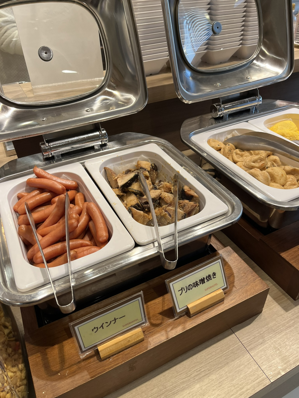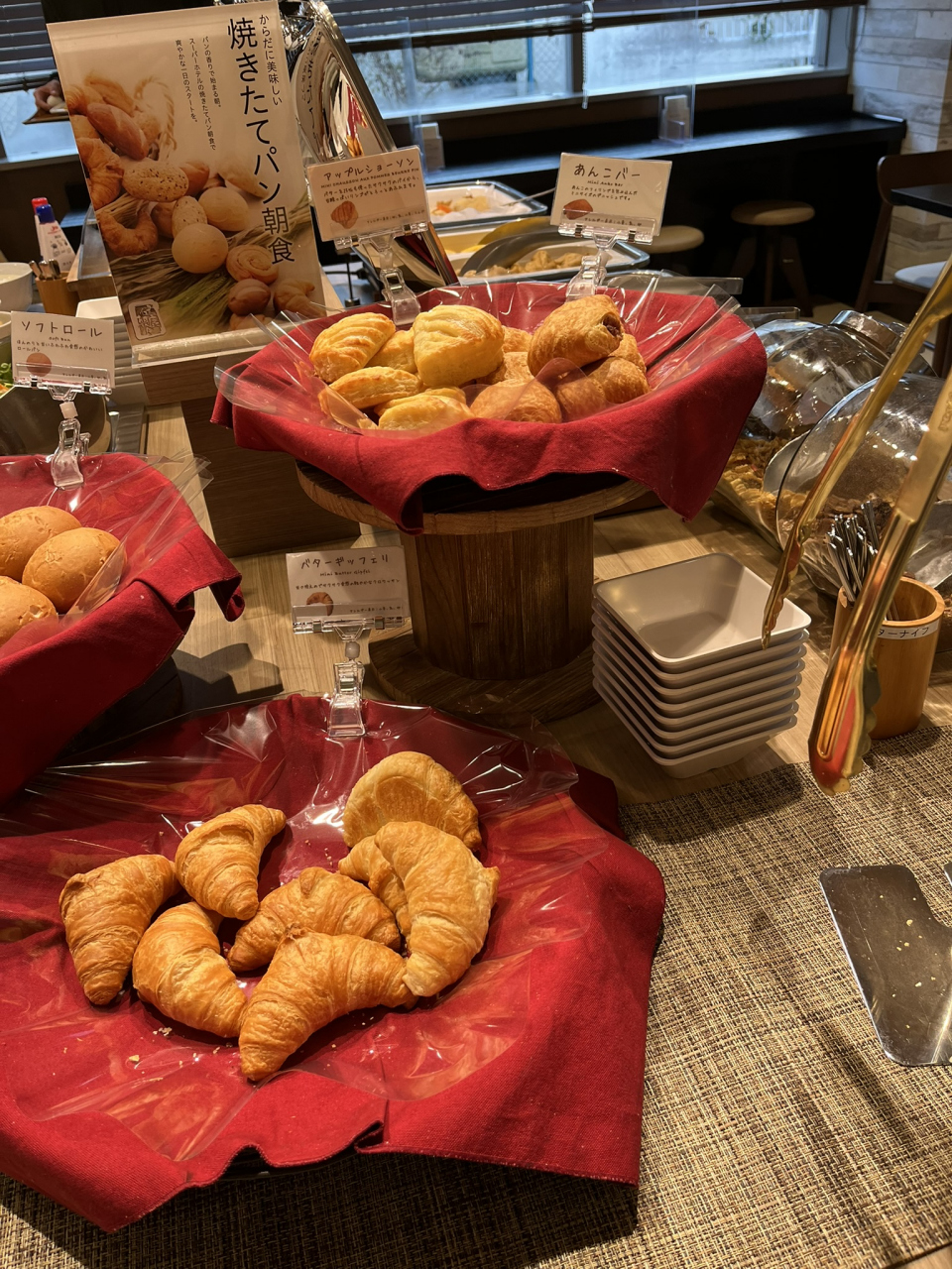 結果として部屋と温泉はスーパーホテル品質でまったく問題がなく、朝食も余裕のもったテーブルで焼き立てパンを頂けました。この焼き立てのパン、めっちゃ美味しかったです!