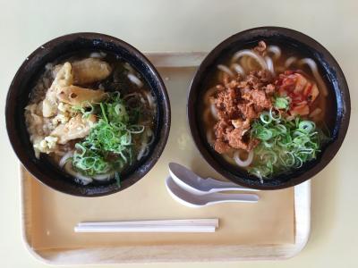 今回は牧のうどん一押しの肉ごぼう天うどんと豚キムチうどんを注文しました。