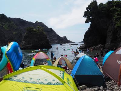 ただ、ゴロゴロの石の浜はとても狭く、日陰もないので、ほとんどの人がテントを持参してくるためそこら中テントだらけです。
