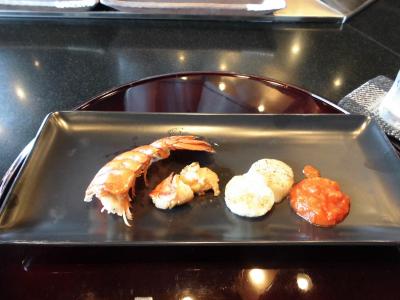先付け、オマール海老とホタテ、彩りサラダ、牛ヒレステーキにご飯と味噌汁です。最後に珈琲とデザートを別室でいただきました。ホタテとオマール海老が大好きなので予約しました。生ビールを入れても五千円未満でおすすめです。