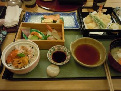 宿泊したオーセントホテル内の和食処です。外に食事に出るよりゆっくり頂きたいと思って予約しました。宿泊者に優しいメニューもあります。私は入舟御膳を、友人は握り寿司御膳を頼みました。入舟御膳には小鉢、珍味、天ぷらに海鮮三食丼、デザートがつきました。鮨御膳には小鉢、中鉢、茶碗蒸しにメインの握り寿司が10貫です。