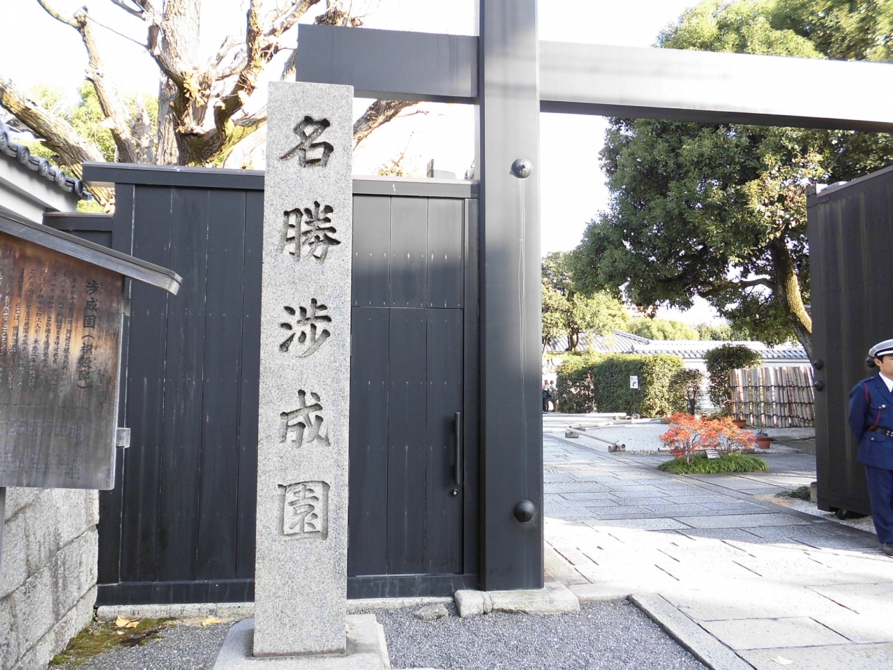 造園当時、周囲に枳殻(カラタチ)を生け垣として植えたことから枳穀邸と呼ばれる草です。お城の庭園のシーンなどで時代劇のロケ地にも使われています。