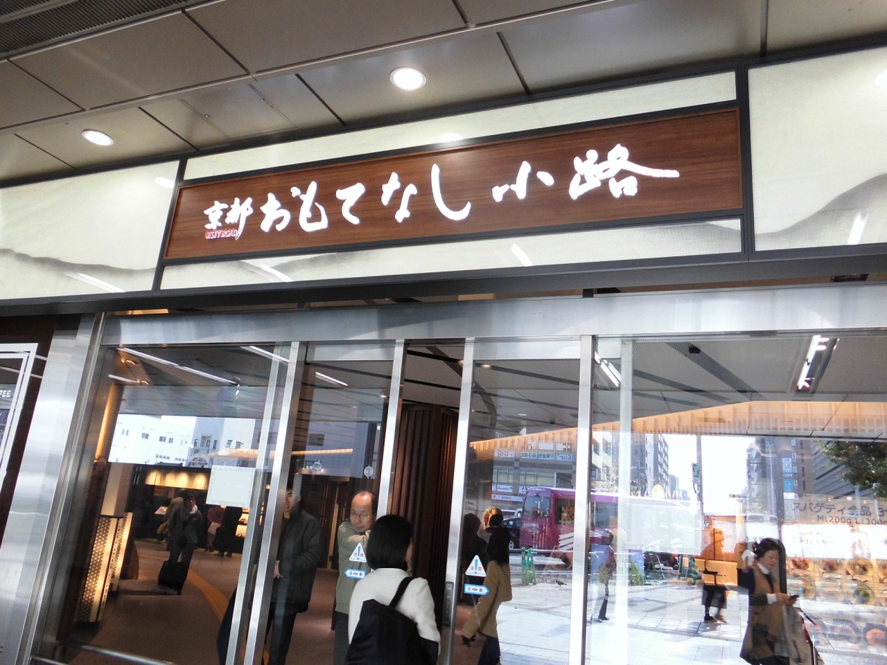 京都駅の新幹線八条口改札と八条東口改札の間にある商業施設で、京都のお土産品やカフェ、レストランなどが並びます。レストランゾーンが「おもてなし小路」として改装され新しい店も出店していて、とてもお洒落な雰囲気になりました。
