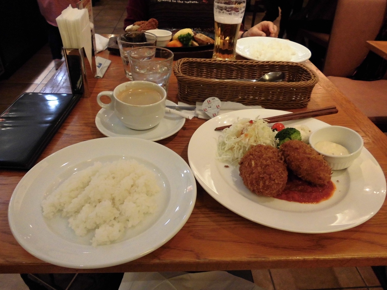 コロッケは単品だったので、ライスと珈琲とサラダをつけたら結構割高になりました。ランチタイムのセットみたいな物がお得です。セットだとメインにサラダバーとライスがついています。初めてだったので知らなくてハンバーグを食べ損ないました。- 旅行時期
