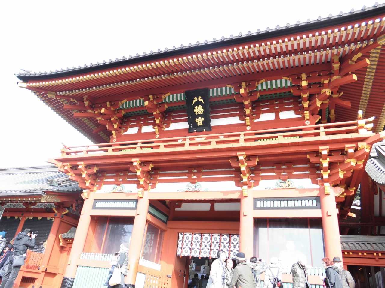 源頼朝ゆかりの神社ということですが、いつ来ても参拝の人が多いです。61段の大石段の上にある楼門は朱色が鮮やかで見応え充分です。八幡宮の八の字が鳩が向き合っている形だと改めて気づきました。