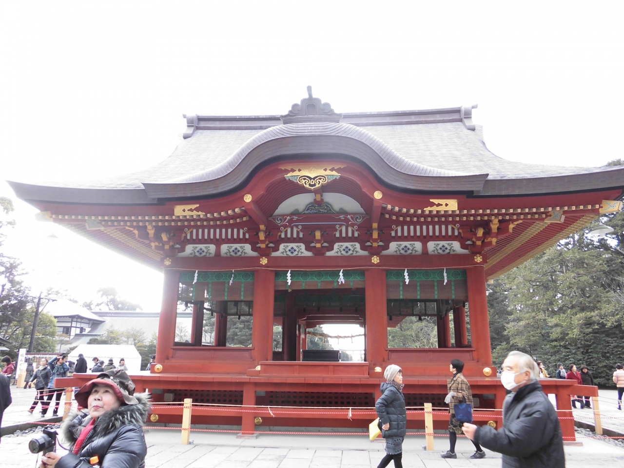 鶴岡八幡宮の本殿に続く大石段の下にあり、色鮮やかなこじんまりとした建物です。義経が愛した静御前が頼朝の前で舞を披露したと伝えられています。(ガイドさんが話してくれました。)