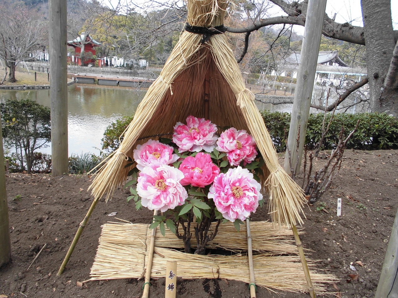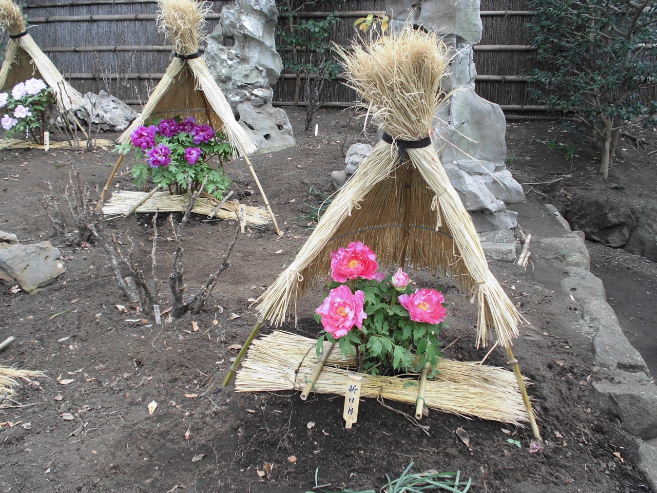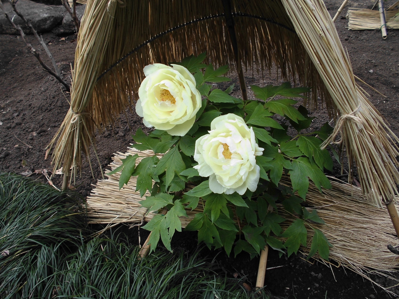 今回、特に珍しい色の牡丹を見ました。前にもあったかも知れないけれど今回気づきました。白い(クリーム色)の牡丹です。雪よけの藁もまた牡丹に似合っていました。- 旅行時期