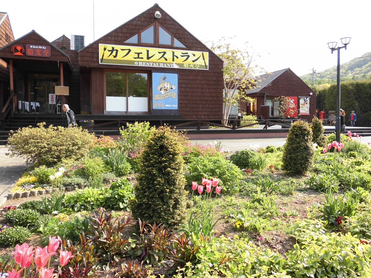 麓に火山村やウスザンロープウエイ、カフェ、レストランなど観光施設も充実しています。ここでチューリップや水仙など春の花が咲いているのを見つけました。九州と一ヶ月違うなと思いました。