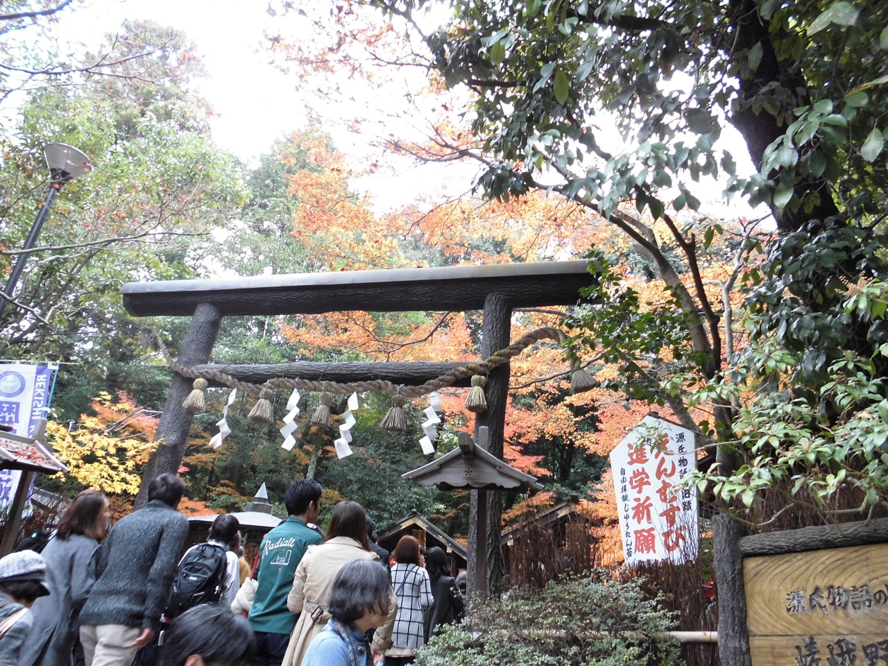嵐山竹林をしばらく歩くと黒い鳥居の神社があります。小さな神社ですが、学問、良縁、子宝の神様として知られ、参拝者は多いようです。参拝の順番を待つ人の行列が出来ていました。