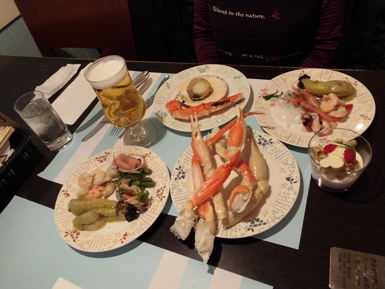 ズワイガニはゆで蟹と天ぷらで出されました。やはりタラバが食べ応えあります。料理はいろいろありましたが、エビや烏賊、ホタテなどの海鮮の料理が充実していると思いました。若い人向きのステーキやビーフシチューなどお肉もいろいろあります。