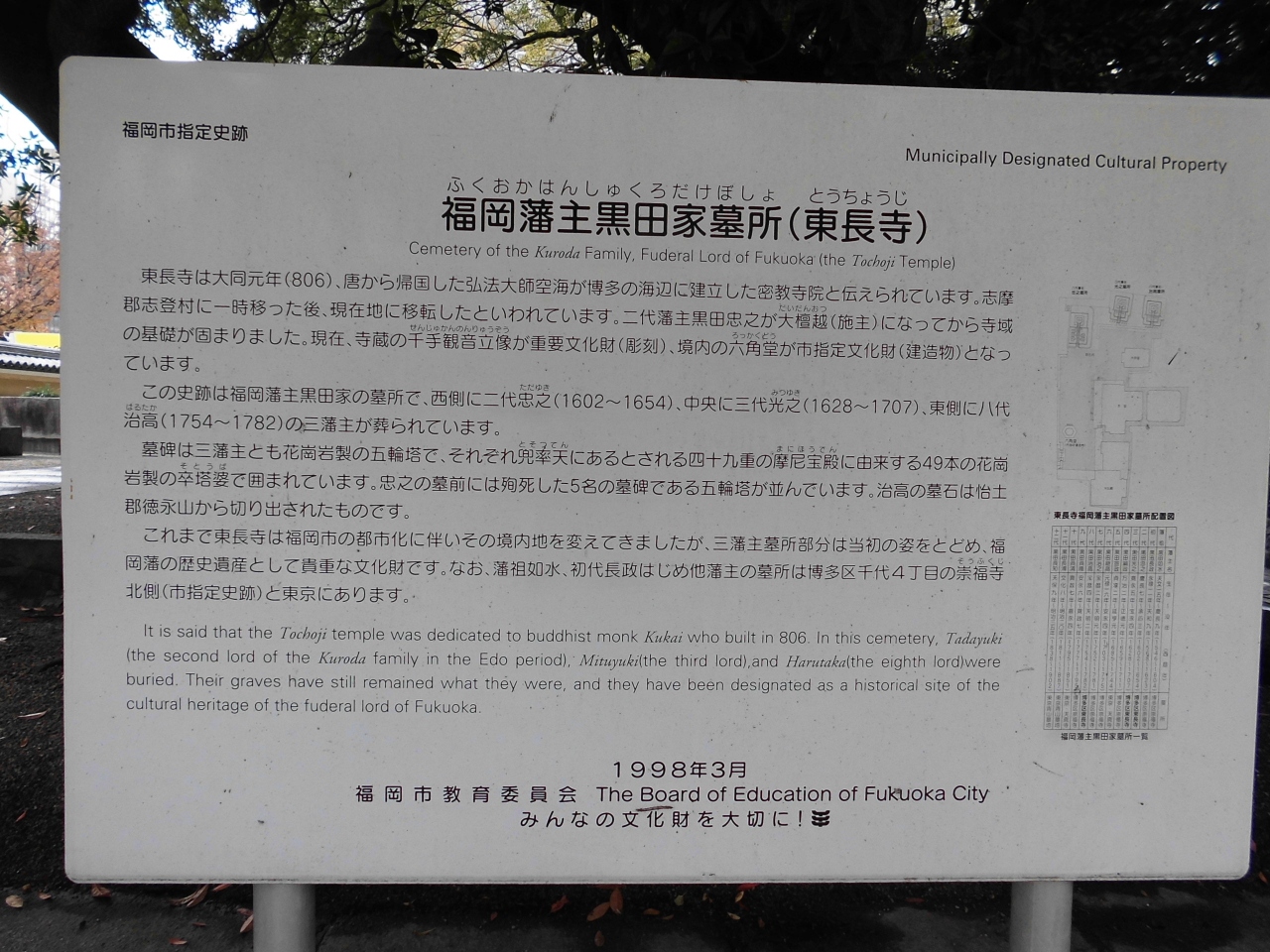 東長寺に黒田家の墓所があることは行って見て初めて知りました。結構大きくて目立つのは2代目忠之公の墓の様です。ドラマで有名な黒田官兵衛の孫に当たる人だそうです。 3代目光之公、8代目治高公の墓もならんでいます。すぐそばの大楠の木が翌合っていると思いました。