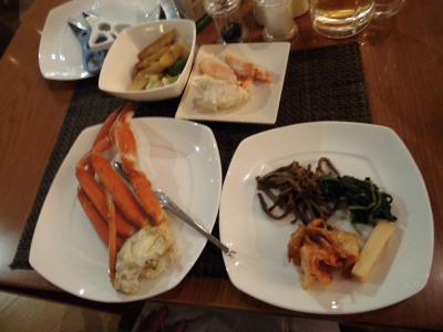 ホテルでは広めの部屋でゆっくり過ごし温泉も2カ所とも楽しみました。夕食は和食のバイキングレストランを選び、郷土料理をいろいろ頂きました。時々太鼓が鳴って新しくできたての料理が紹介されるので楽しみながら食事が出来ました。予想していなかった蟹や牡蛎フライが後からだされて、友人が喜びました。