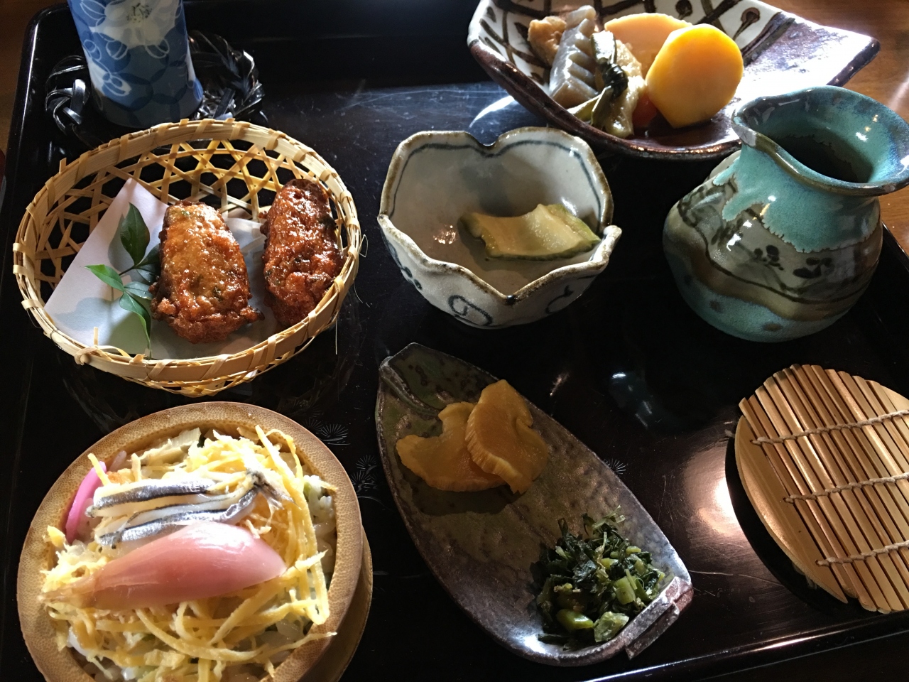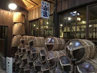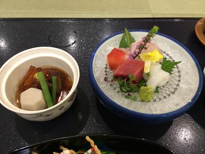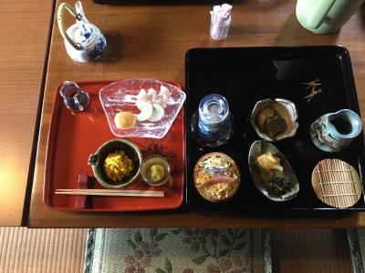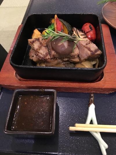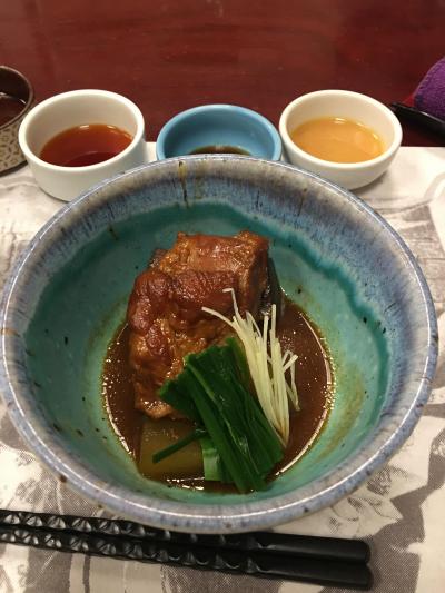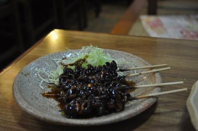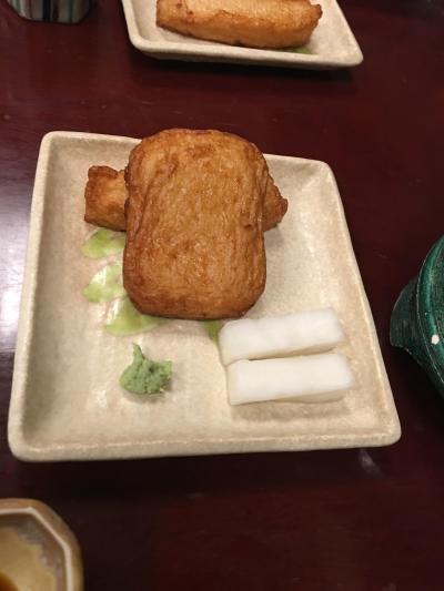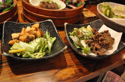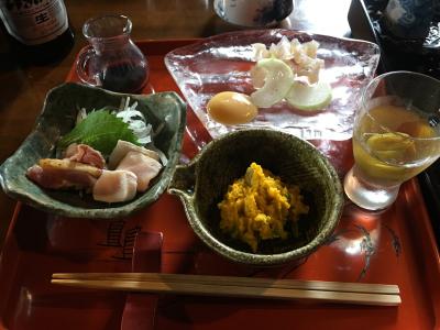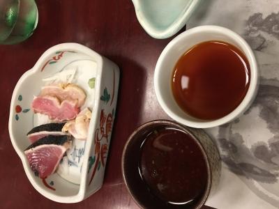 鹿児島の田舎料理ということで、地鶏の刺身に芋こんにゃくの刺身、さつま揚げに、おそば、デザートに両棒もちと、おなかいっぱいになりました。