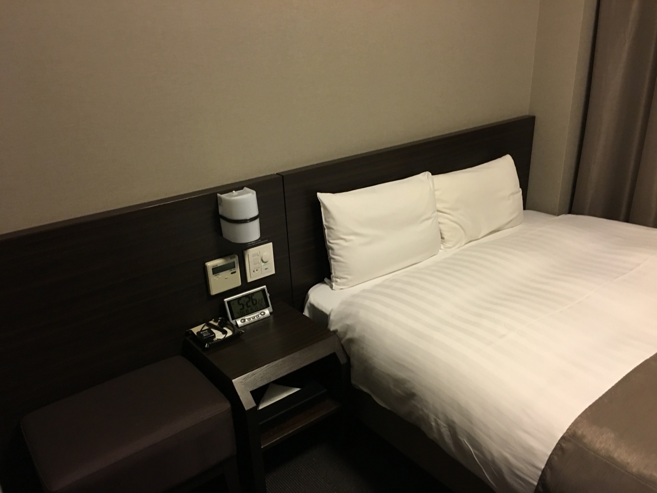 部屋はダブルベッドに、バストイレ、テレビ・冷蔵庫等々、Wi-Fiはサクサク入りました。