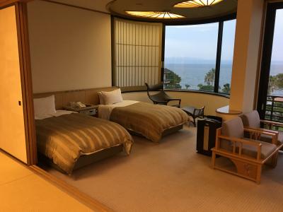 建物は何棟かあって広いです。宿泊したのは離宮という和洋室で、ツインベッドと和室の海側の部屋に2人で宿泊、広すぎました。(笑)
