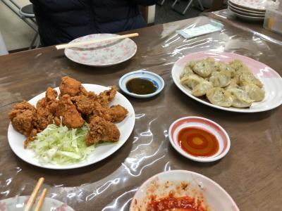 「宝雲亭」のひと口餃子と「とり福」の骨なしから揚げ、キムチを注文しました。